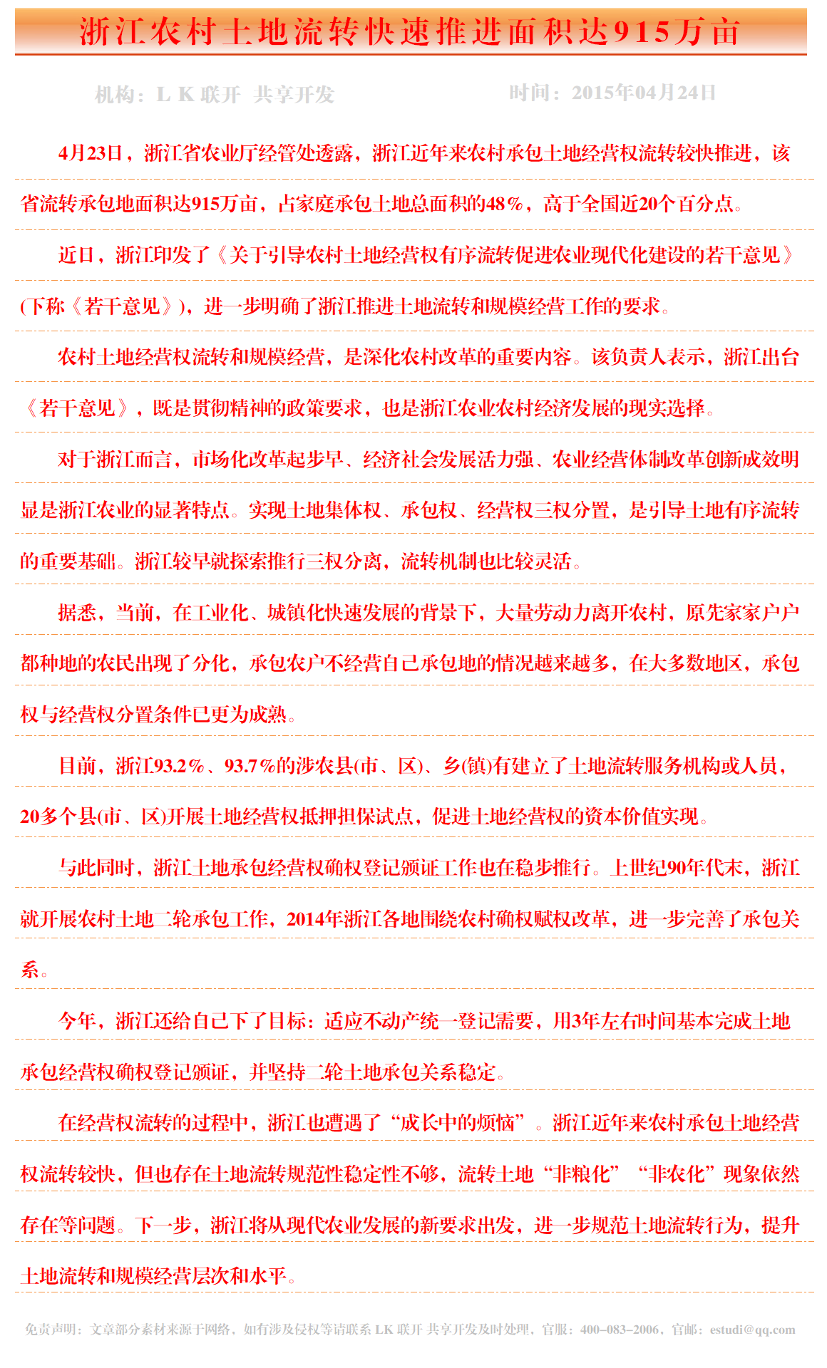 浙江农村土地流转快速推进面积达915万亩