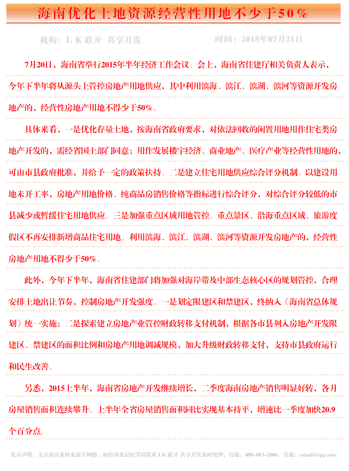 海南优化土地资源经营性用地不少于50%