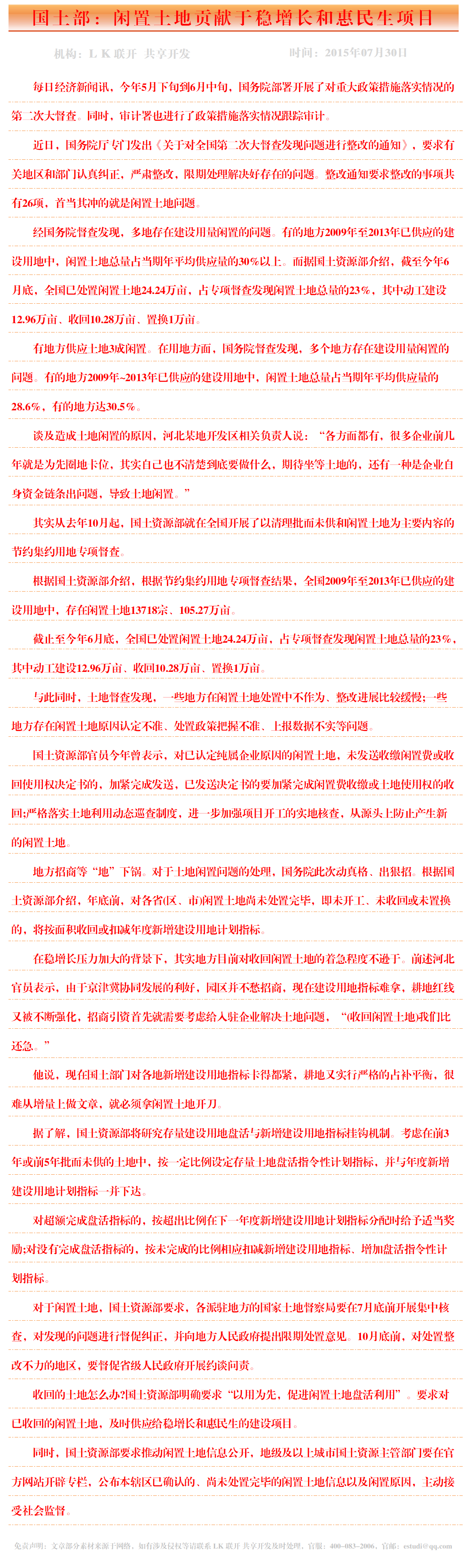 国土部:闲置土地贡献于稳增长和惠民生项目