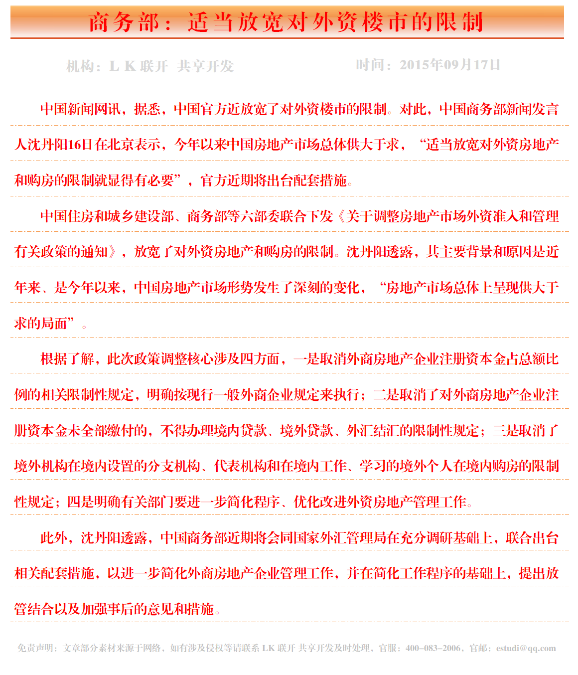 商务部:适当放宽对外资楼市的限制