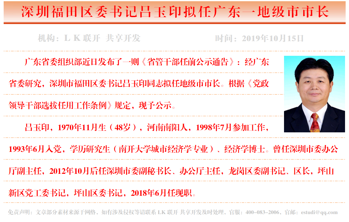 深圳福田区委书记吕玉印拟任广东一地级市市长