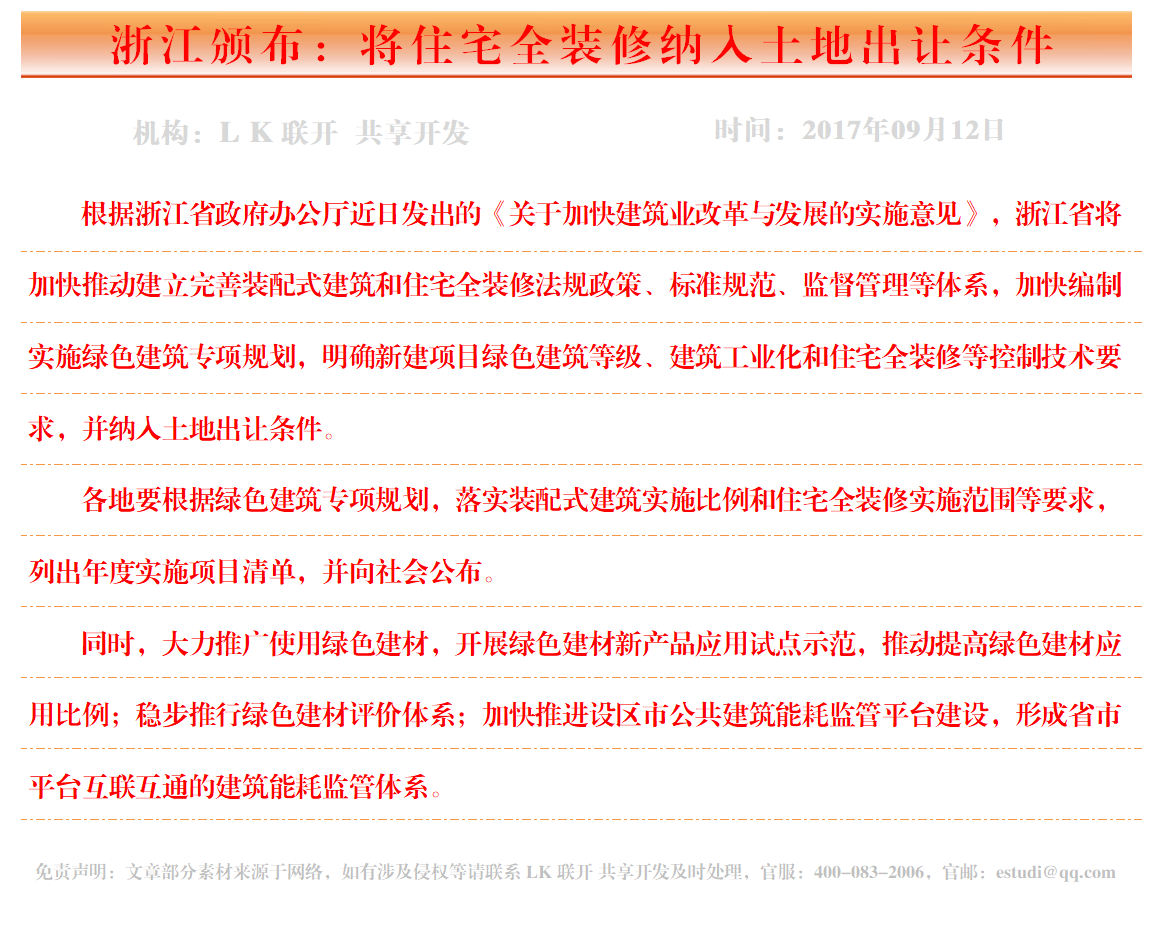 浙江颁布:将住宅全装修纳入土地出让条件