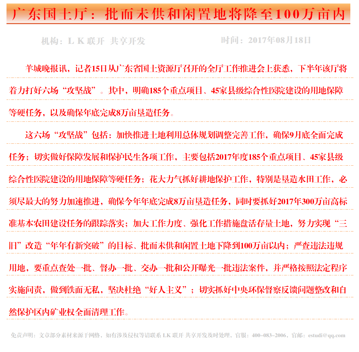 广东国土厅:批而未供和闲置地将降至100万亩内