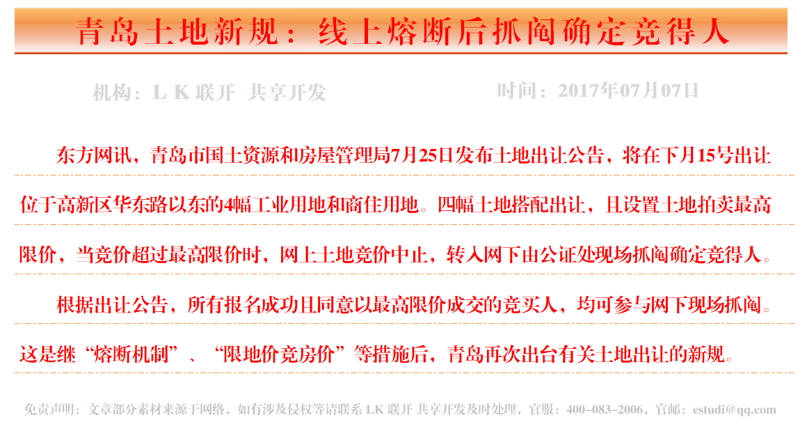 青岛土地新规:线上熔断后抓阄确定竞得人