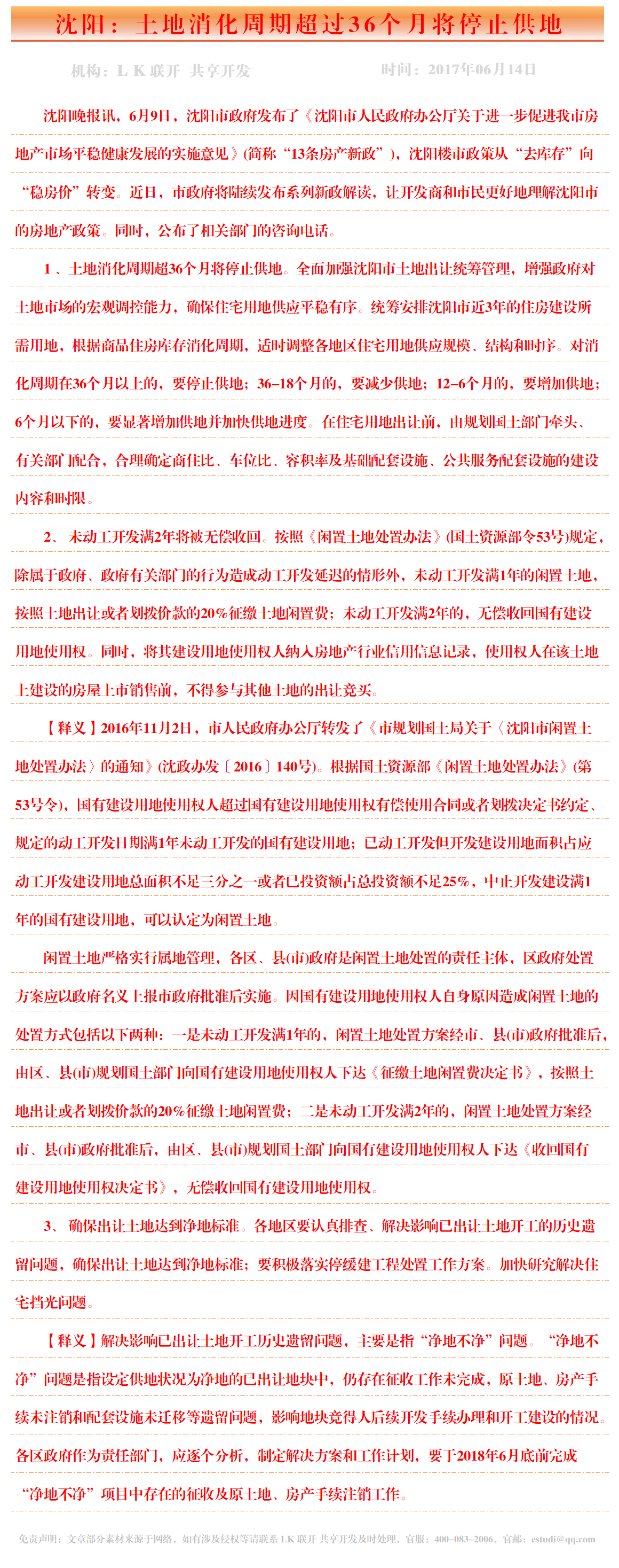 沈阳:土地消化周期超过36个月将停止供地