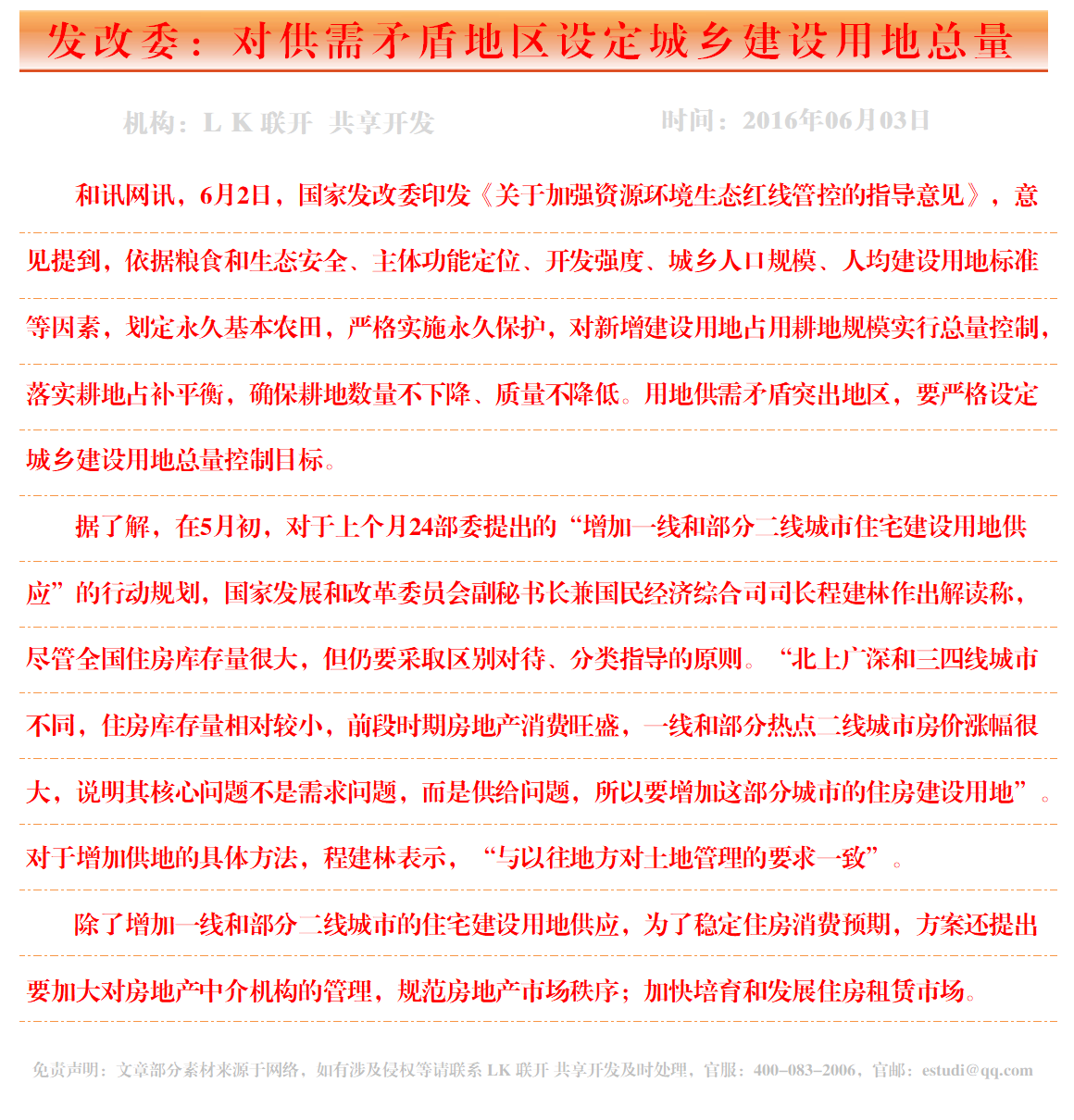 发改委:对供需矛盾地区设定城乡建设用地总量