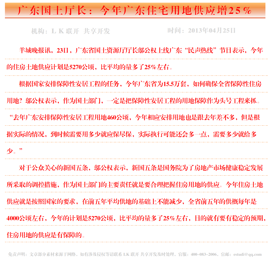 广东国土厅长:今年广东住宅用地供应增25%