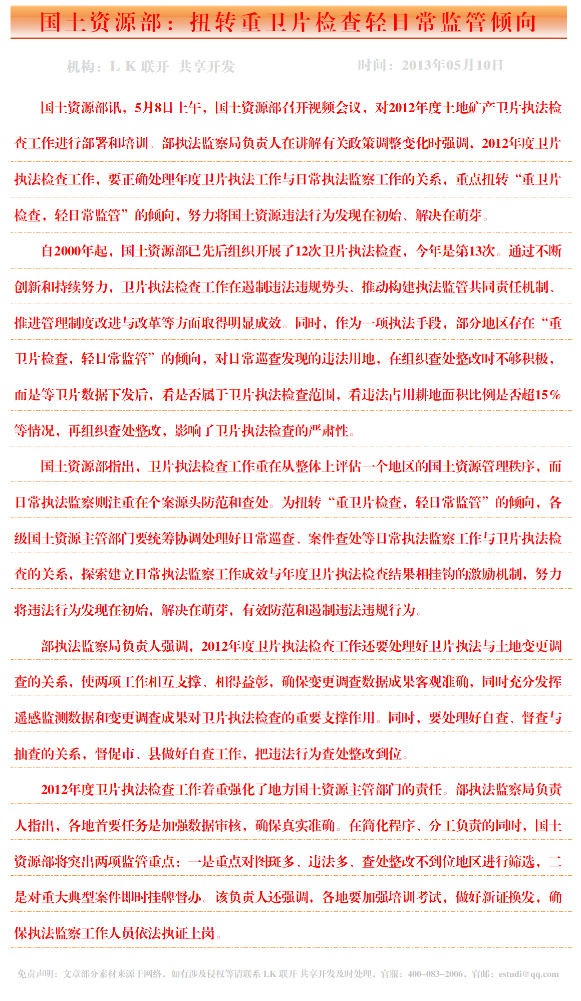 国土资源部:扭转重卫片检查轻日常监管倾向