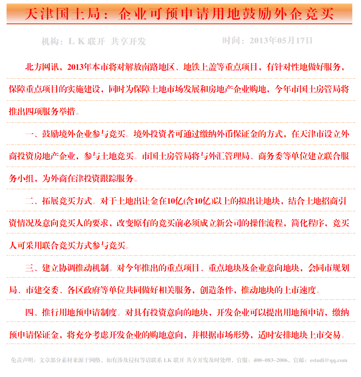 天津国土局:企业可预申请用地鼓励外企竞买