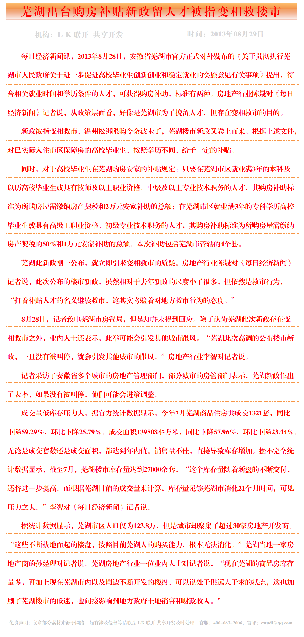 芜湖出台购房补贴新政留人才被指变相救楼市