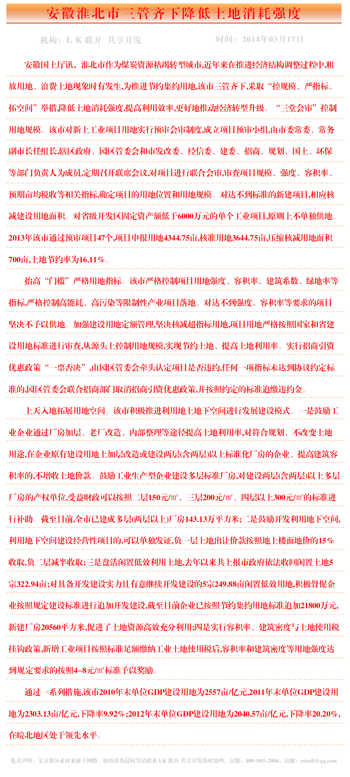 安徽淮北市三管齐下降低土地消耗强度