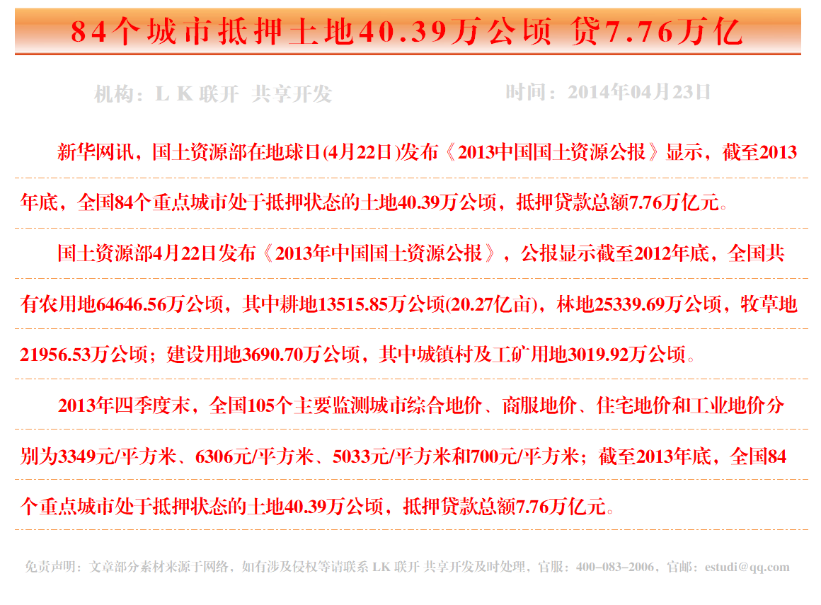 84个城市抵押土地40.39万公顷 贷7.76万亿