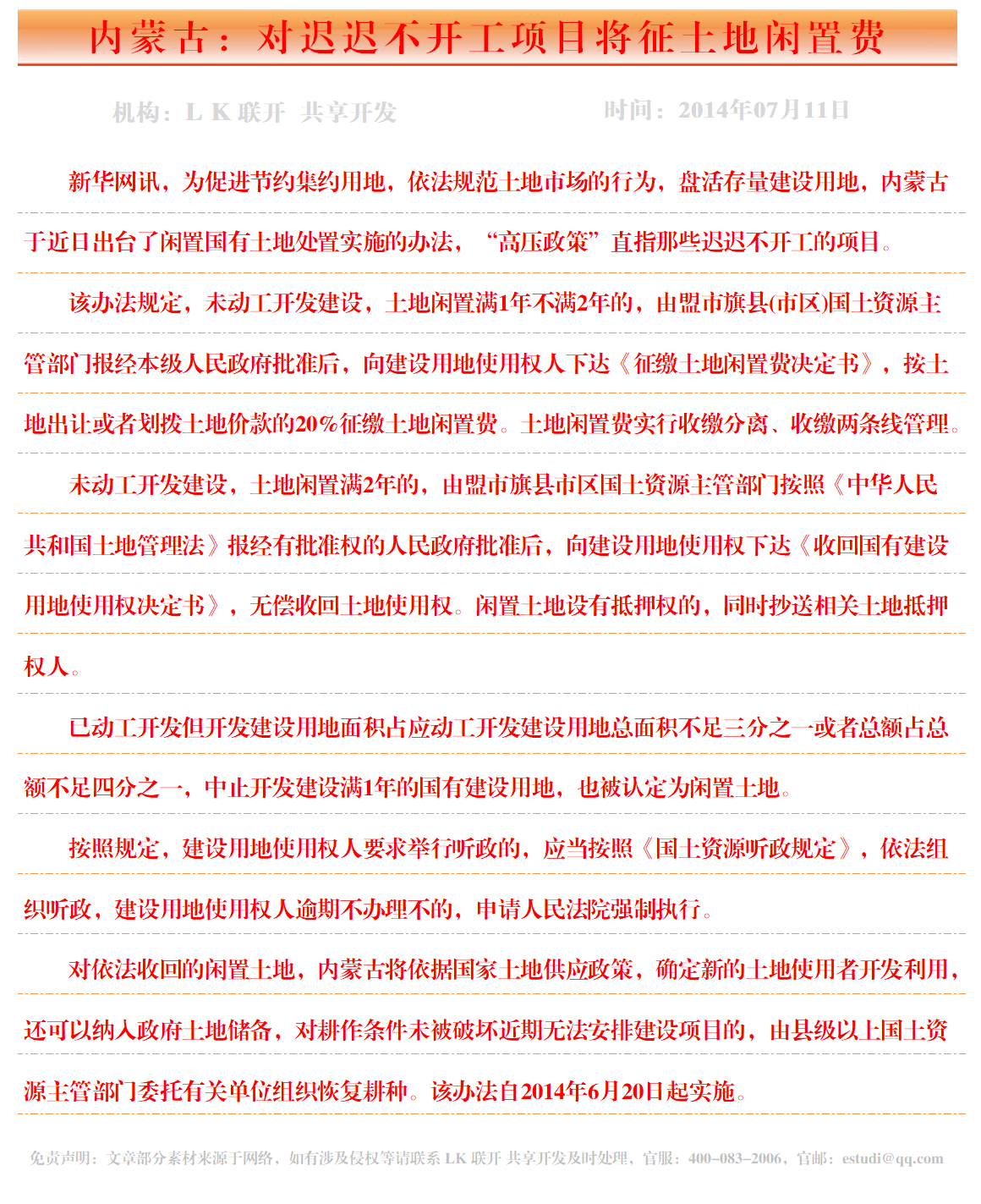内蒙古:对迟迟不开工项目将征土地闲置费