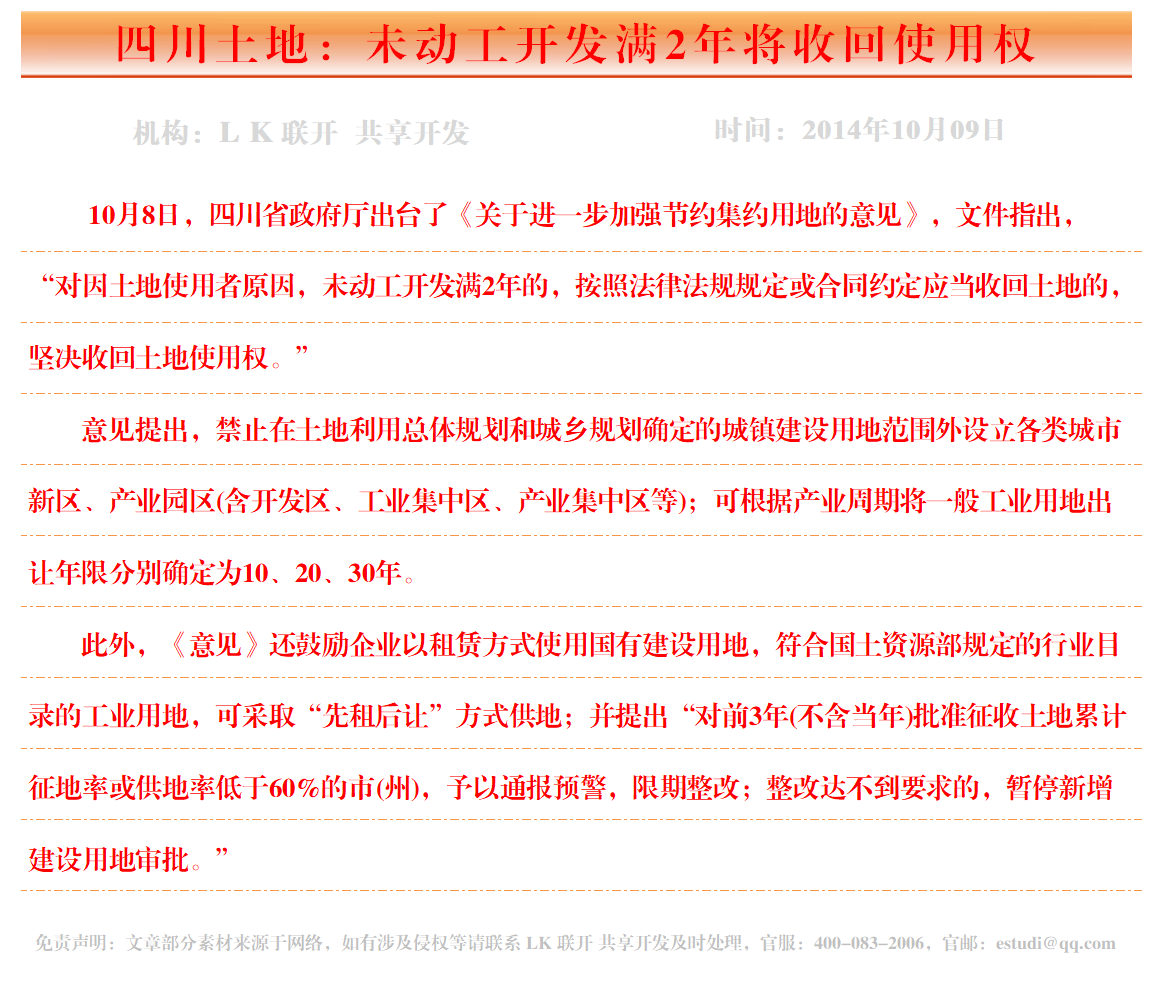 四川土地:未动工开发满2年将收回使用权