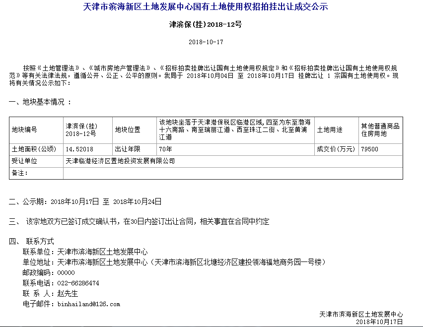 | 挂牌楼面单价 | 3650 | 成交楼面单价 | 3650 | 挂牌成交单位 | 天津临港经济区置地投资发展有限公司 | ||