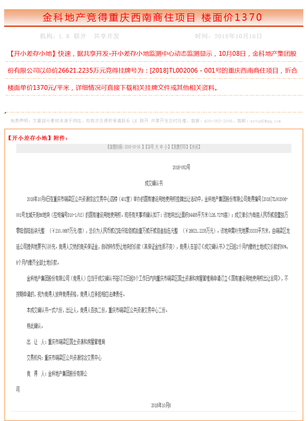 | 挂牌楼面单价 | 1369 | 成交楼面单价 | 1370 | 挂牌成交单位 | 金科地产集团股份有限公司 | ||