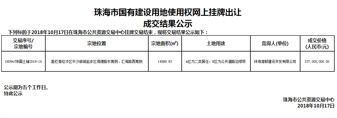 | 挂牌楼面单价 | 5209 | 成交楼面单价 | 5851 | 挂牌成交单位 | 珠海港毅建设开发有限公司 | ||