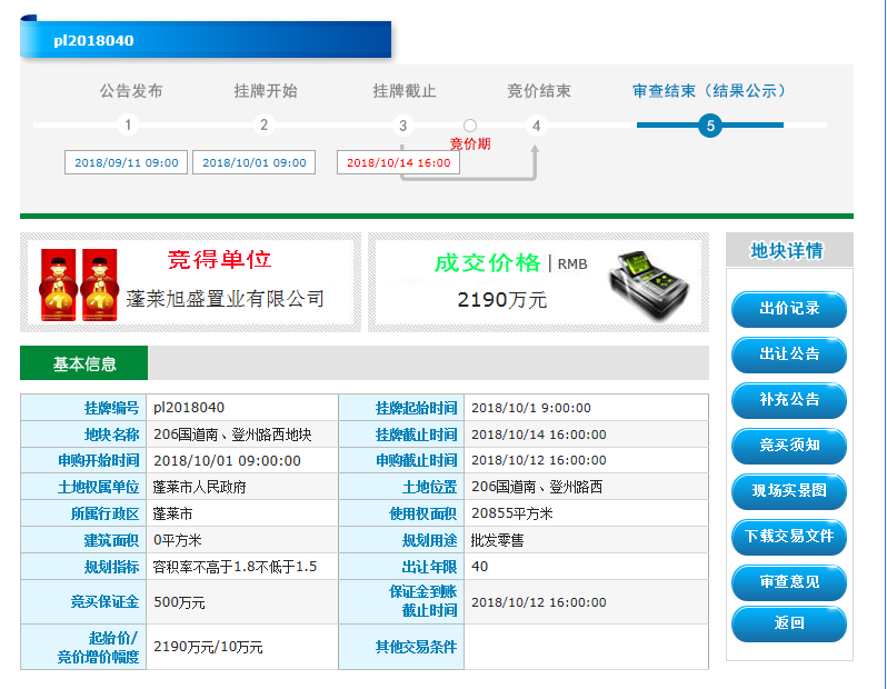 | 报价企业个数 | 挂牌出让 | 成交总价万元 | 2190 | 有效竞拍次数 | 存小地@监测中 | 挂牌成交时间 | |
