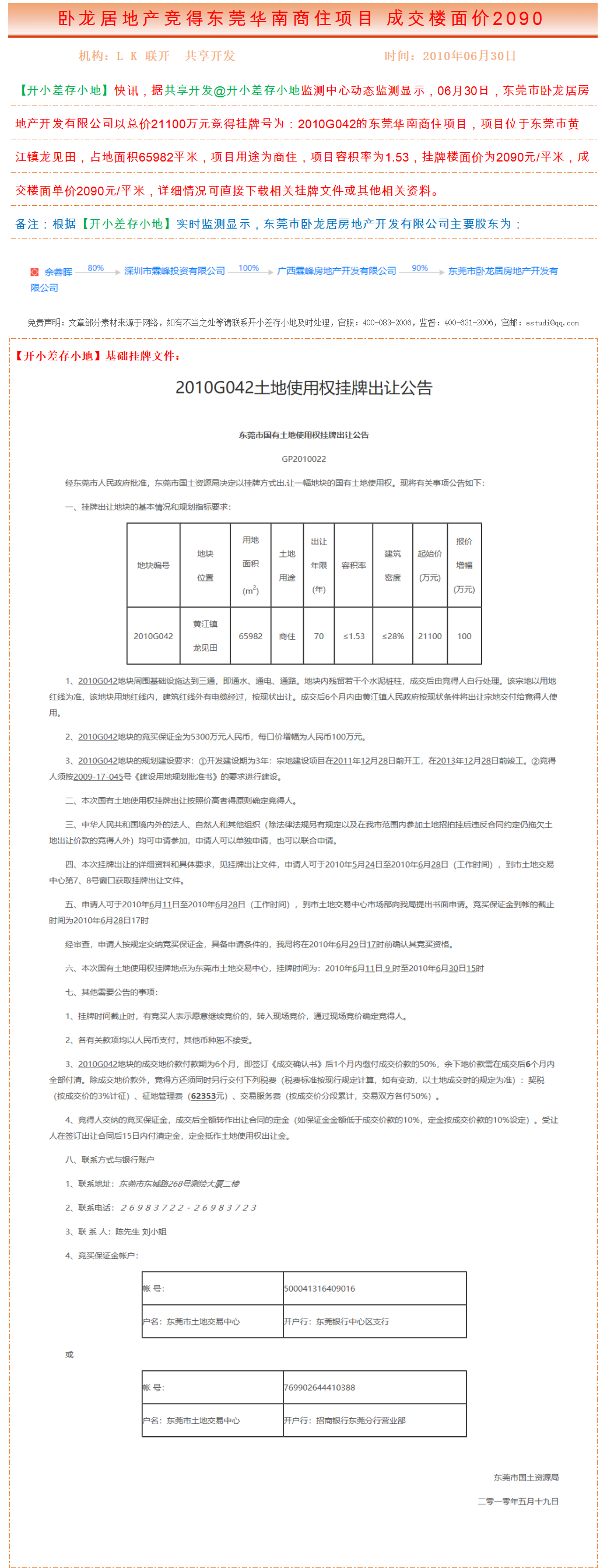 挂牌楼面单价 | 2090 | 成交楼面单价 | 2090 | 挂牌成交单位 | 东莞市卧龙居房地产开发有限公司 | ||
