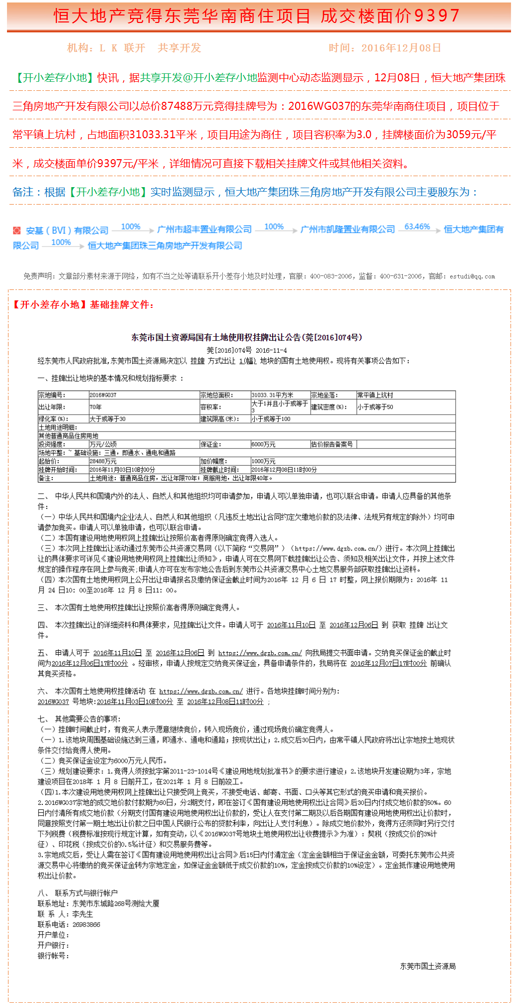| 挂牌楼面单价 | 3059 | 成交楼面单价 | 9397 | 挂牌成交单位 | 恒大地产集团珠三角房地产开发有限公司 | ||