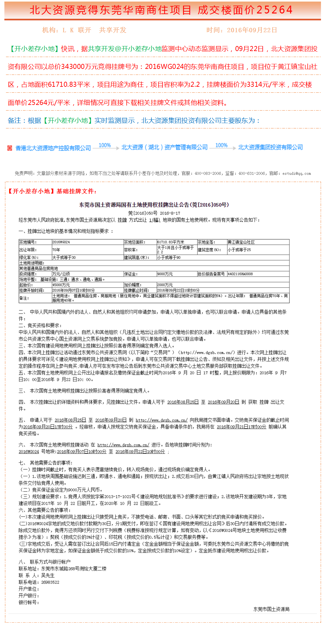 | 挂牌楼面单价 | 3314 | 成交楼面单价 | 25264 | 挂牌成交单位 | 北大资源集团投资有限公司 | ||