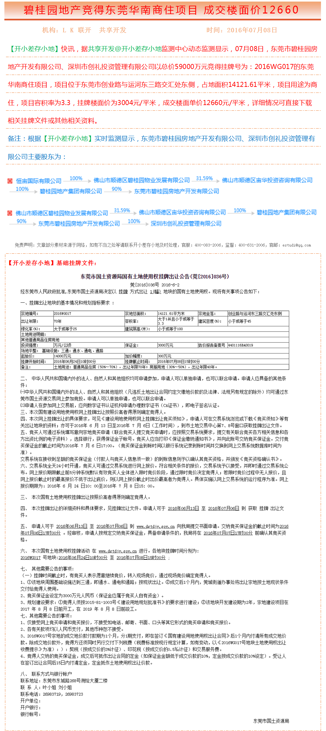 | 挂牌楼面单价 | 3004 | 成交楼面单价 | 12660 | 挂牌成交单位 | 东莞市碧桂园房地产开发有限公司、深圳市创礼投资管理有限公司 | ||