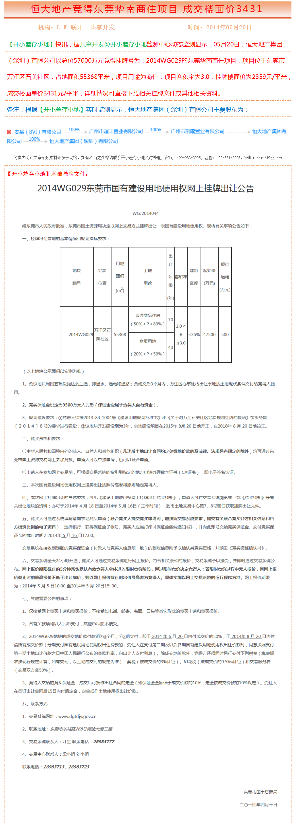 挂牌楼面单价 | 2859 | 成交楼面单价 | 3431 | 挂牌成交单位 | 恒大地产集团(深圳)有限公司 | ||