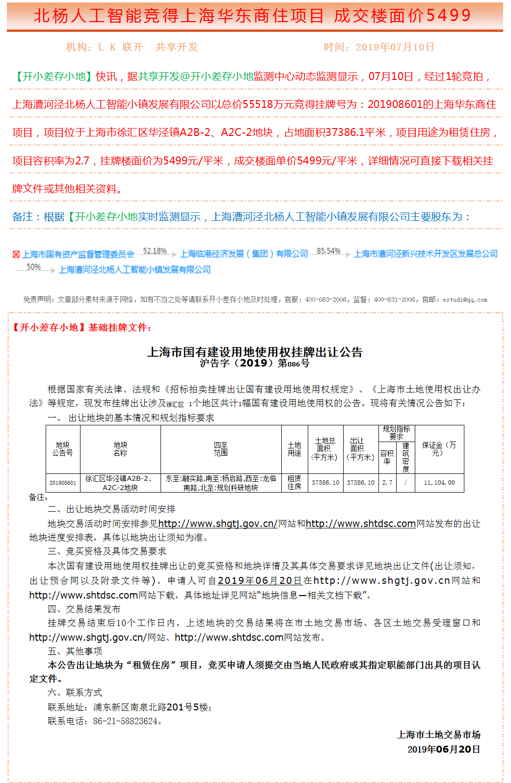 挂牌楼面单价 | 5499 | 成交楼面单价 | 5499 | 挂牌成交单位 | 上海漕河泾北杨人工智能小镇发展有限公司 | ||