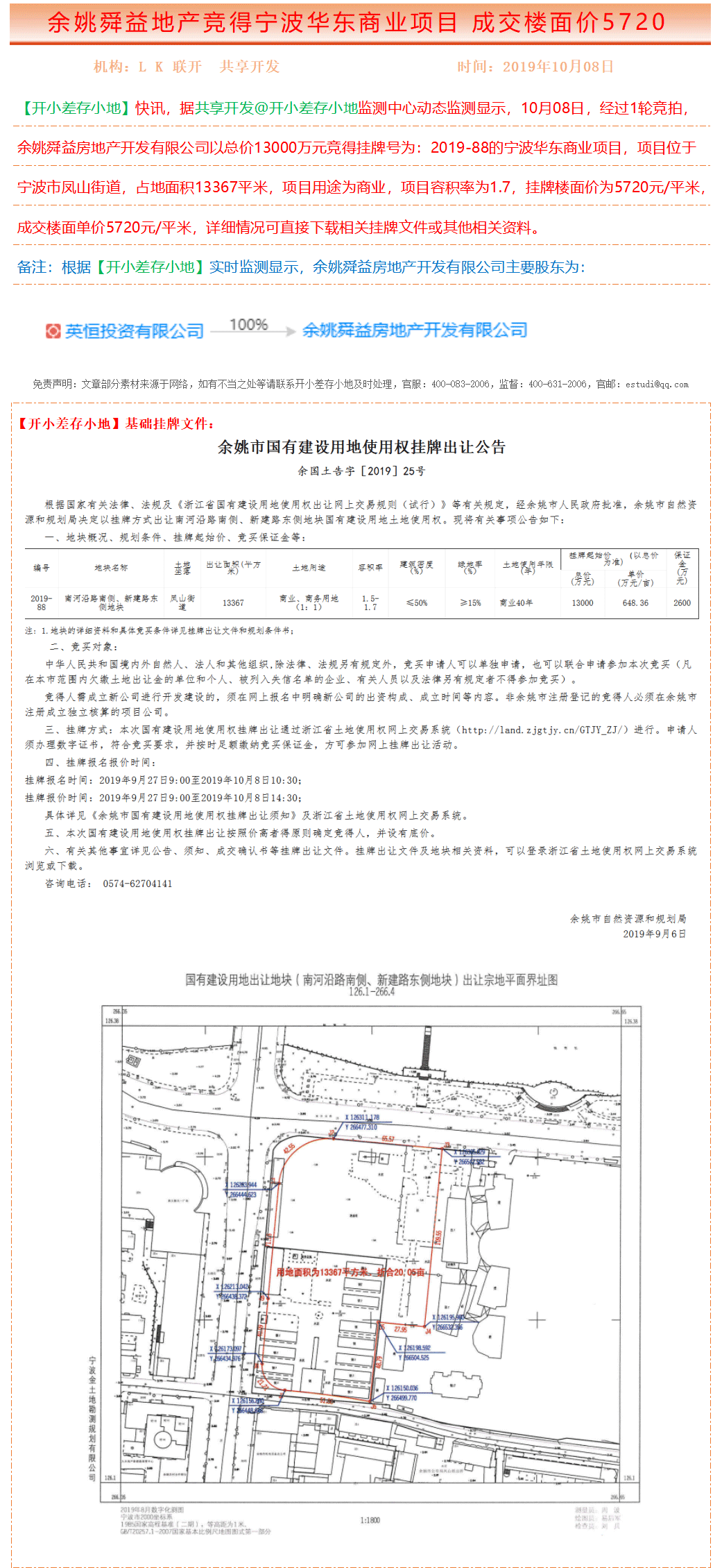 | 挂牌楼面单价 | 5720 | 成交楼面单价 | 5720 | 挂牌成交单位 | 余姚舜益房地产开发有限公司 | ||