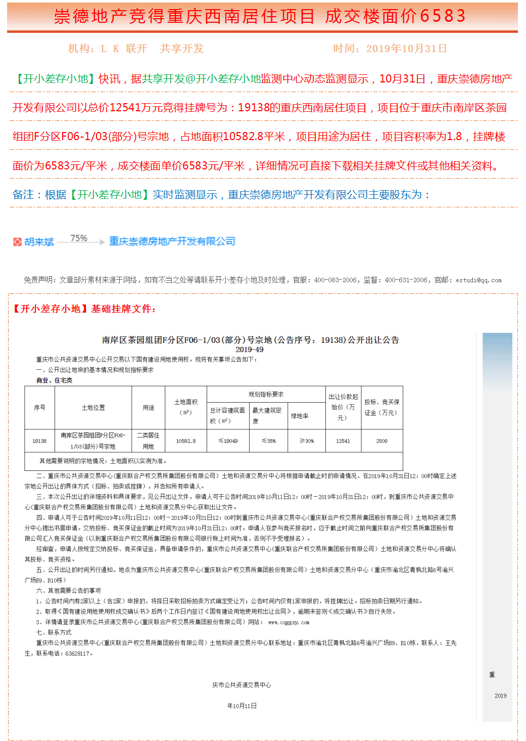 | 挂牌楼面单价 | 6583 | 成交楼面单价 | 6583 | 挂牌成交单位 | 重庆崇德房地产开发有限公司 | ||