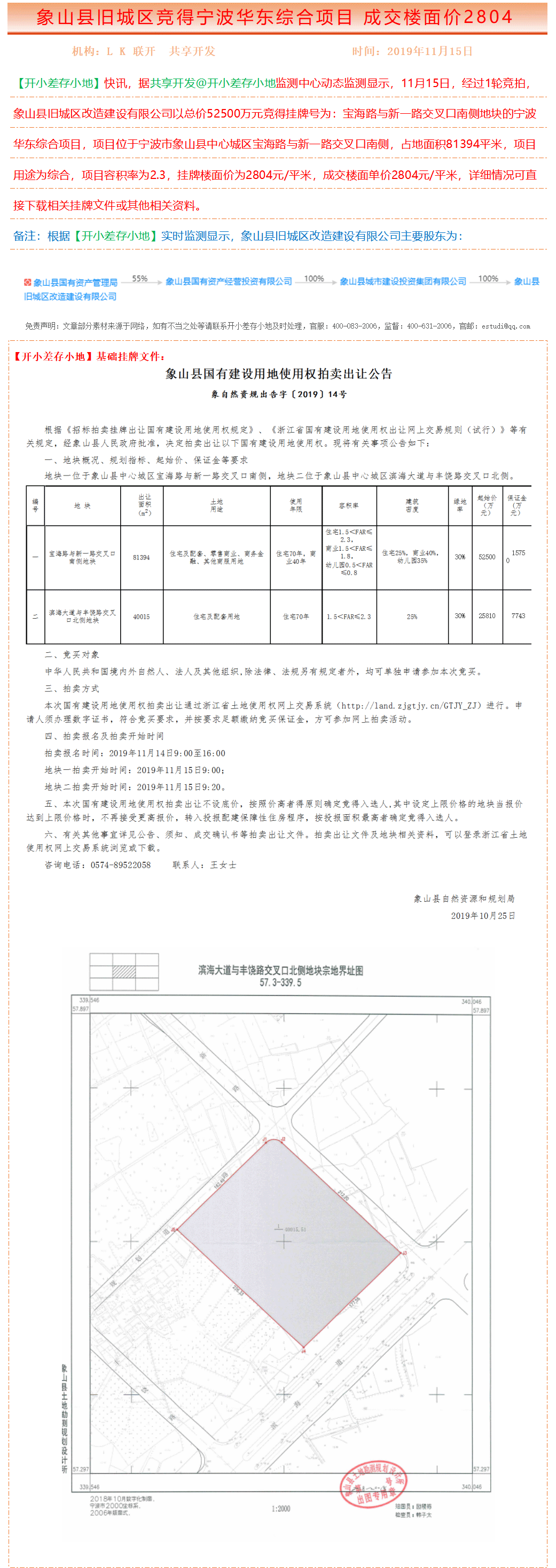| 挂牌楼面单价 | 2804 | 成交楼面单价 | 2804 | 挂牌成交单位 | 象山县旧城区改造建设有限公司 | ||